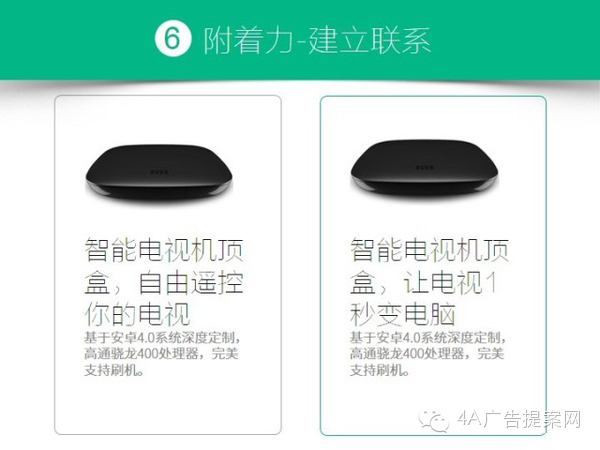比如上图,假设你完全不了解电视机顶盒,它宣传“自由遥控”,你可能没什么概念;但是如果说“让电视1秒变电脑”,你就明白了—原来是可以像电脑一样自由操控电视啊!