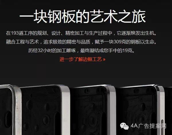 互联网初创公司无不把产品分割成一个个独立属性。小米先是给我们普及了CPU丶GPU等,到了小米4,竟然开始给我们普及材料学知识—“小米4,奥体304不锈钢,8次CNC冲压成型”。