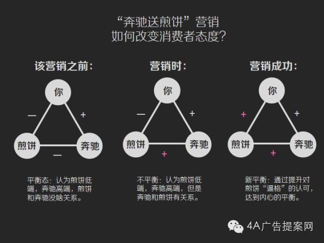 平衡理论认为人对关系相近的事物会持有同样的态度—“爱屋及乌”。而一旦人们发现关系相近的事物给自己带来不同的感觉,他就会改变态度。