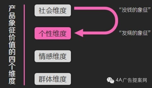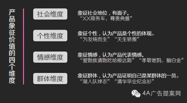 产品的象征一般有4个维度,分别是社会、个性、情感和群体。(见下图)