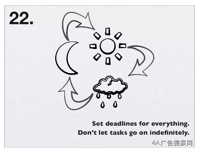 22、给所有事情都设定一个期限。不要让工作无期限地进行下去。