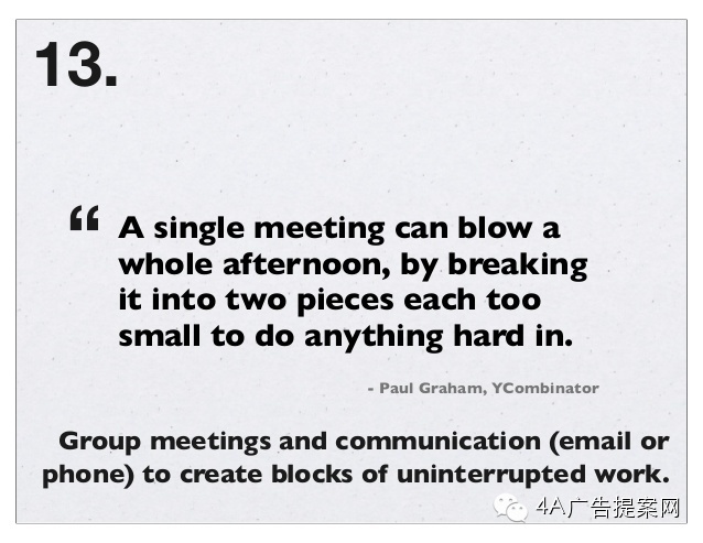 13、把会议和沟通 (邮件或电话) 结合,创造不间断工作时间。