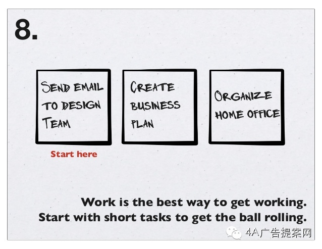 8、进入工作状态的最佳方式就是工作,从小任务开始做起,让工作运转起来。