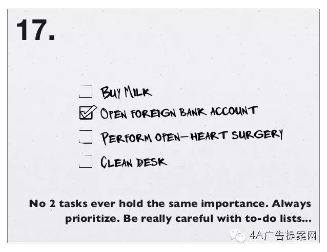 17、从来没有两个任务会有相同的优先级,总会有个更重要,仔细考虑代办事情列表。