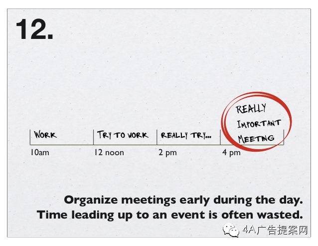 12、有会议就尽早安排,用于准备会议的时间往往都浪费掉了。