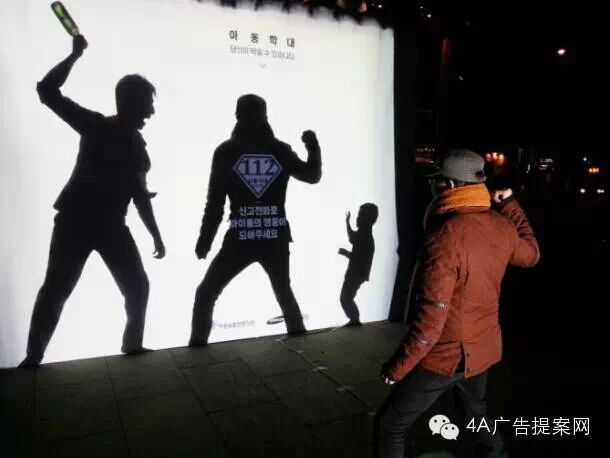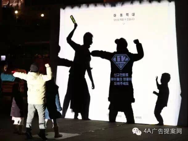 在 韩国的街头,就有一块有趣的户外广告牌,在没有人参与的情况下,这块广告牌就是一副正在施虐儿童的画面,但当有用户上前观看时,自身的影像会被投射到广告 牌上,通过路人不同的动作与造型,就可改变广告画面的意境:即通过路人的互动参与,实现并传递对虐待儿童行为阻止的重要性。