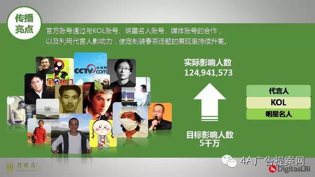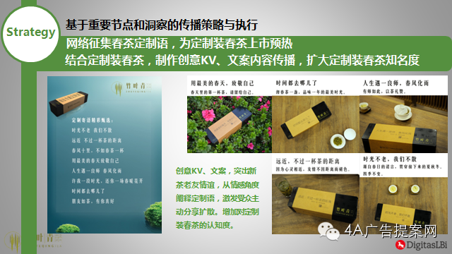 在 整个#新茶老友#的立意下,本次春茶上市的社会化传播以代言人、明星、名人以及线上推广定制装春茶为媒介开启专属定制模式,并通过定制美好祝福贺卡赠与好 友,建立与受众的亲和力。活动的第一阶段启动征集新茶老友的春茶定制语,引发了很多对竹叶青关注的老用户主动分享扩散,为了能把春天里的第一杯茶送到旅居 日本的吴清源大师手里,我们在网络上开启了“为他乡的大师,送杯家乡的春茶”送茶接力事件,迅速引爆了整个网络,为竹叶青定制春茶的传播奠定了公关传播的 基础。