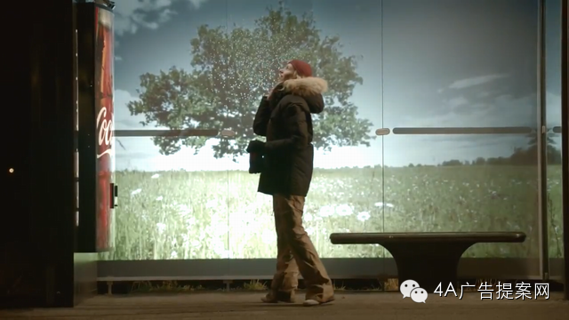 不过,现在,当你走到乌普萨拉街头的一个可口可乐公交站台,当可乐自动售货机感知你到来时,便会在黑暗中亮起暖暖的红光;接着广告牌开始播放瑞典夏季草甸美景,音响里传来欢乐的鸟鸣,一朵朵鲜花投影在地上,伴随着有加热功能的广告灯,好像一下子就阳光明媚,身在夏天啊!