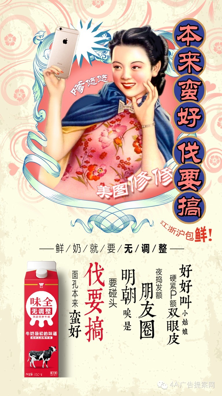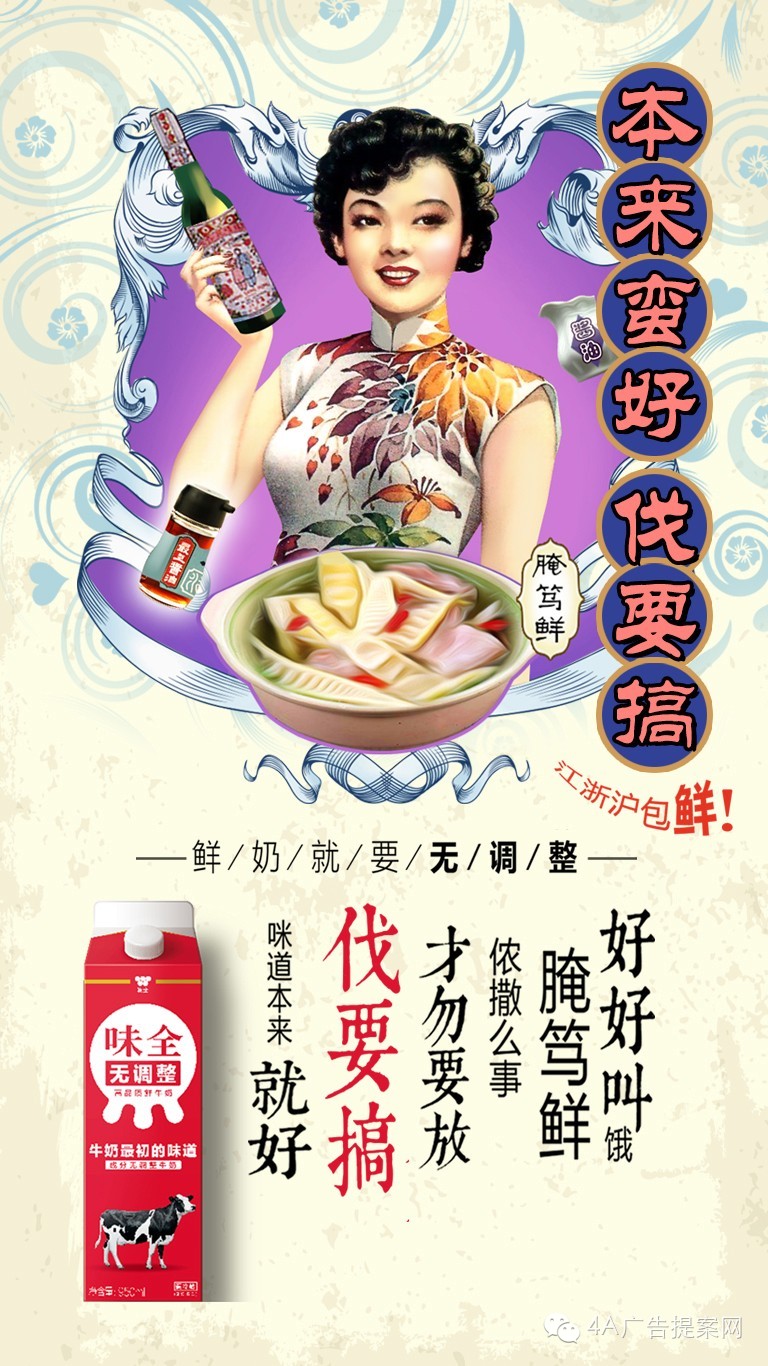 正因为高保鲜的鲜牛奶对产地和运输的高要求,味全牛奶集中在江浙沪销售。将“成分无调整”的牛奶行业术语,转化为#伐要搞,本来蛮好#这一广告语,以上海为中心进行辐射。