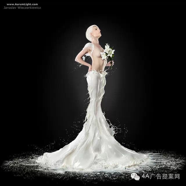 Jaroslav Wieczorkiewicz后来又用牛奶,水为模特们量身订做了一套晚礼服。这些喜欢到处乱流的液体在摄影师的镜头下丝毫没有不规矩的表现,飘逸的裙摆丝绸的质感,看完这些,你是否也想弄一件液体的衣服呢?