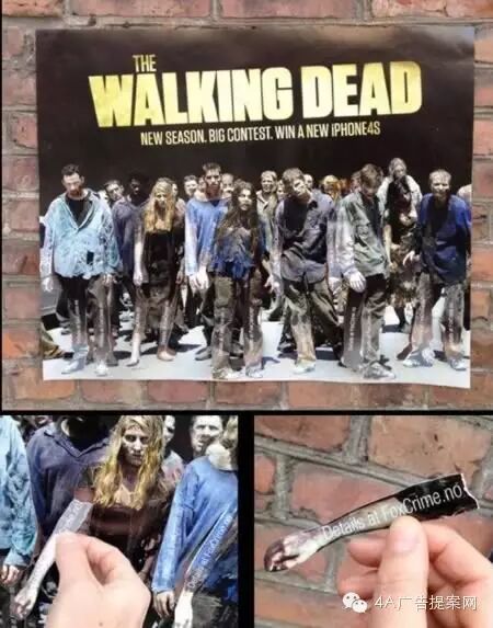 这是Frank Advertising Agency公司为《行尸走肉》新季在挪威的比赛赢iPhone4S活动做的广告,画里每个人的四肢都是可以撕拉的广告小条。