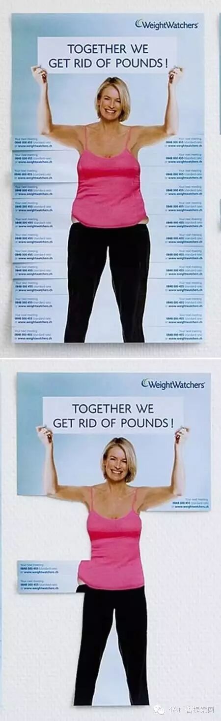 这是广告公司Euro Rscg Group Switzerland为瑞士Weight Watchers设计的广告。小条一张张的撕掉,胖妹也能变女神。