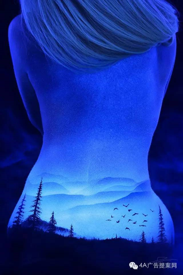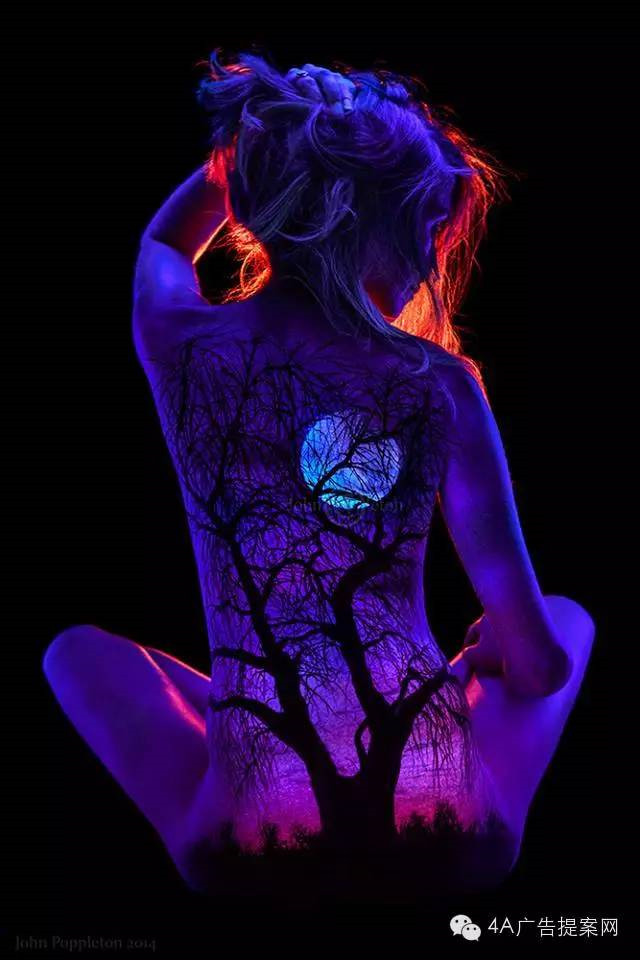 John Poppleton是一个有着20年职业生涯的婚礼摄影师。他使用特殊的荧光粉在模特身上画出星夜、山水、海洋、日落等各种美丽的风景,以背灯勾勒出模特的体态,然后在黑光灯下(一种可以释放出无害的UV紫外线来激发荧光的气体放电灯)创作出了了一组组叹为观止的艺术作品.