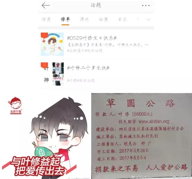 叶修生日话题霸榜新浪话题,粉丝自发以其名义做起了公益,捐款铺路、捐赠公益午餐等。这架势是不是和三次元鲜肉流量有的一拼。