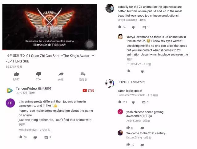 值得一提的是,《全职高手》动画在youtube同步播放英文版。难得的中国面孔惊艳了歪果仁,全职影响力全球发散的同时,也不断推动着国产动画在海外市场的前进。