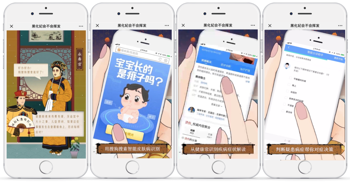 整支H5,在情节设计上,尽量还原宫廷感;通过对人物妆容的刻画、配音、细节的动效,为H5加分。而通过“黑化妃”各种疾病的剧情设定,向用户直观传递了产品信息:有疾病,先问搜狗搜索,小到健康常识,大到疾病问题,都能给出权威科普;并且通过智能分诊,能够给出最有可能的疾病问题;针对剧情中所提到的,永琮身患痱子or湿疹的问题,也能一键识别!