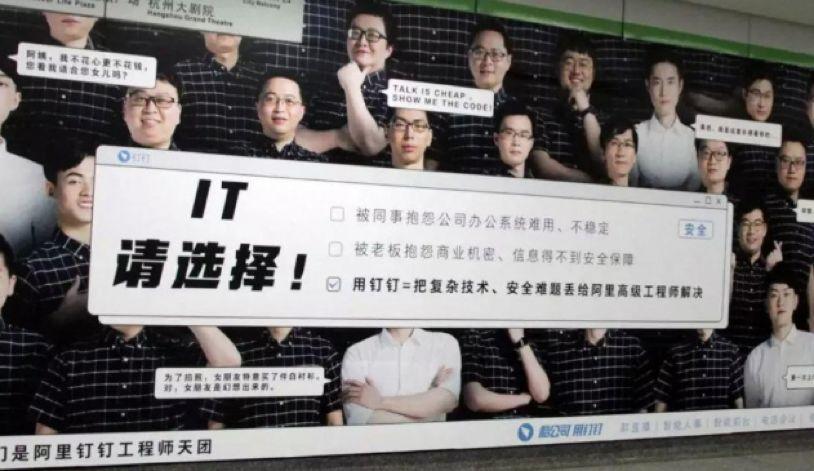 懂得不失时机打动目标群体,更懂得细分目标群体的钉钉,除了在重要节日节点上表现亮眼,在日常的事件打造上也不落人后。钉钉轰动全网的一次地铁爆款营销,就是送自家企业的500名程序员“成功出道”:统一的格子衫、真诚的笑脸、搞怪逗趣的彩蛋式文案,吸引了大量搭乘地铁人员的驻足观看。自带话题属性的程序员,不仅将这系列海报直接送上了当天的话题热搜,也让钉钉的企业级产品得到更多人的关注,直接增强了产品能见度。