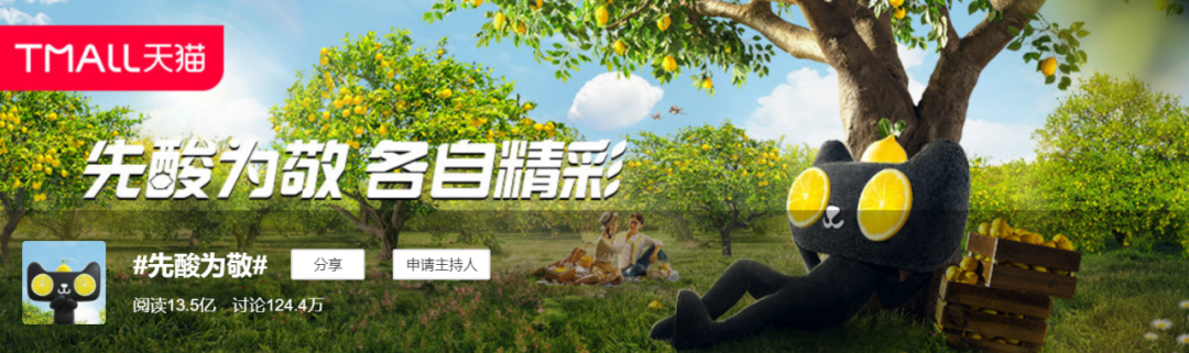 先是阿里自家兄弟品牌发布“有酸同享”接力海报,再有近百家品牌蓝V“酸”诗接龙,用“柠檬遮眼”这个动作撬动群体互动。